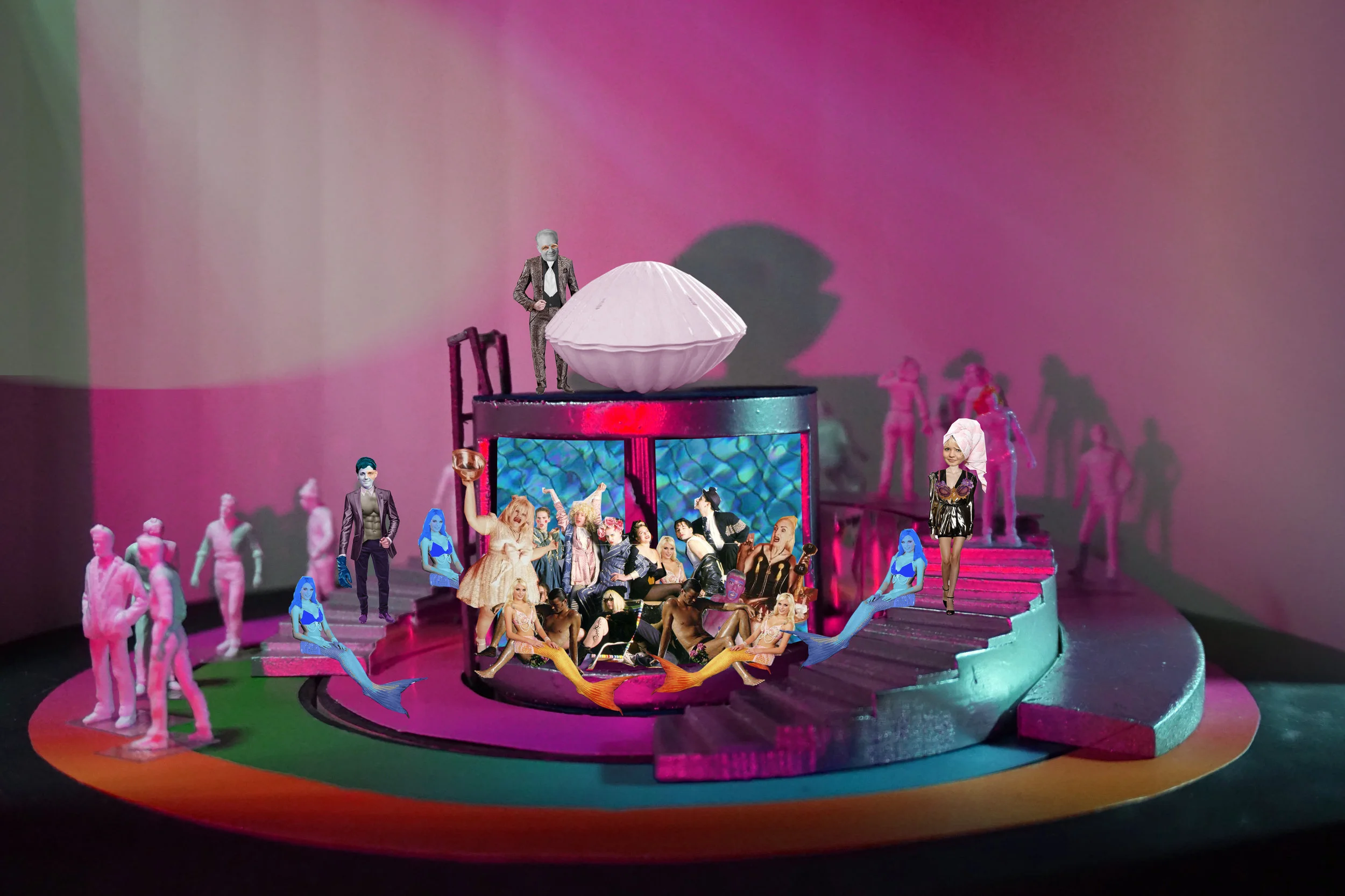Aus der Biografie und den oben erwähnten Romanen habe ich einzelne Figuren und Fragmente entnommen und collagiert. Der Bühnenraum erinnert an ein surrealistisches Gemälde, das aus collagierten Elementen besteht.